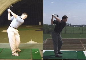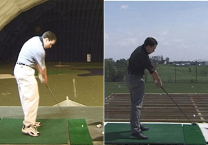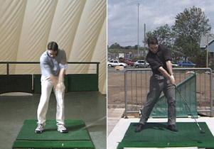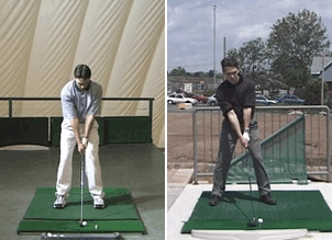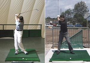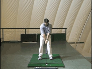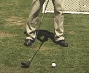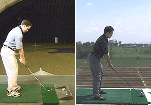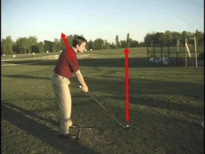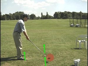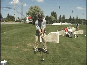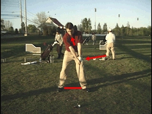 De côté, on peut dénoter certaines qualités même chez un joueur avec aussi peu de technique. Le dos est bien droit et penché à partir des hanches. L’erreur dans cette image en est une d’alignement; ses épaules et ses hanches pointent à la gauche de la cible au lieu d’y être parallèle. Ce genre d’erreur est fréquent chez les golfeurs amateurs. Ils ont l’impression qu’ils sont bien alignés à la cible, mais ce n’est pas le cas. Pour vous aider, vous n’avez qu’à placer à vos pieds un bâton aligné vers la cible.