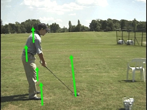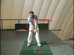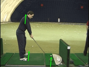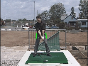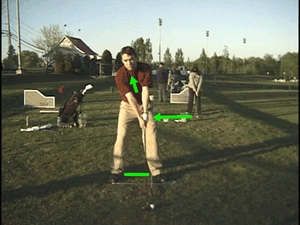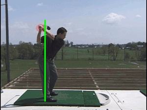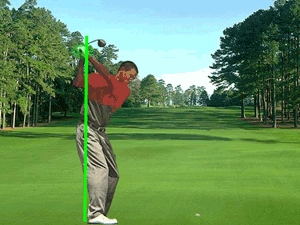Un défaut fréquent chez les golfeurs amateurs est la présence du déplacement latéral « sway » dans l’élan. C’est un déplacement vers l’arrière et ensuite vers l’avant des hanches durant l’élan. Ceci peut causer beaucoup de problèmes au niveau de la coordination lors de l’impact. Cela cause aussi le golfeur à être plus « paresseux » et à moins tourner les hanches et les épaules. Sur l’image ci-haut, j’ai tracé deux lignes vertes au niveau des hanches. Nous pourrons voir sur la prochaine image, la position des hanches par rapport à ces deux lignes vertes.